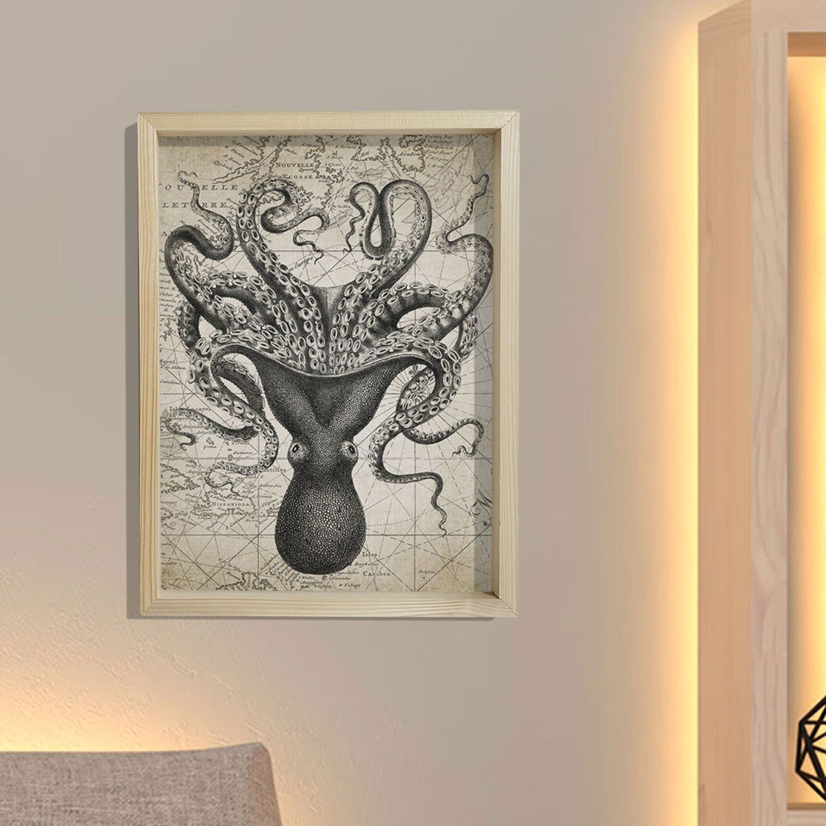 Doğal Çam Çerçeveli Duvar Tablosu Antik Ahtapot ve Harita